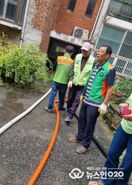 (뉴스인020 = 김성길 기자) 평택시 지산동에 있는 빌라 지하실에 지난 14일 침수가 발생했다. 이에 지산동 자율방재단은 즉시 현장으로 출동해 단원 8명과 함께 긴급 배수 작업을 실시하며 주민 피해 최소화에 나섰다.