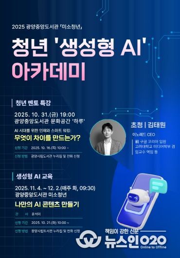 ‘청년 멘토 특강’은 10월 16일 오전 10시부터, ‘생성형 AI 교육’은 10월 21일 오전 10시부터 각각 선착순으로 접수하며, 광양시립도서관 누리집과 전화로 신청할 수 있다. 자세한 사항은 광양중앙도서관으로 문의하면 된다