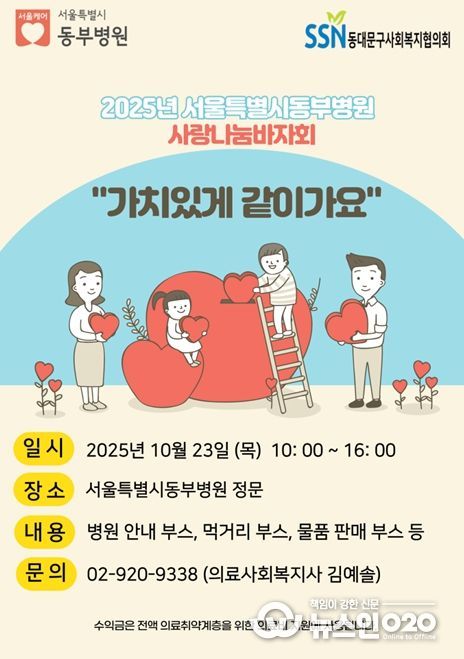 (뉴스인020 = 김성길 기자) 서울시 동부병원이 지역사회와 함께하는 따뜻한 나눔의 장을 마련한다. 동부병원은 23일 오전 10시, 동부병원 정문 앞에서 사랑나눔 바자회 ‘가치있게 같이가요’를 개최한다.