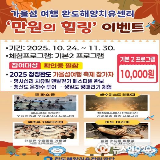 (뉴스인020 = 김성길 기자) 완도해양치유센터에서 10월 24일부터 26일까지 개최되는 ‘2025 청정 완도 가을 섬 여행’과 연계하여 ‘만원의 힐링’ 이벤트를 진행한다.