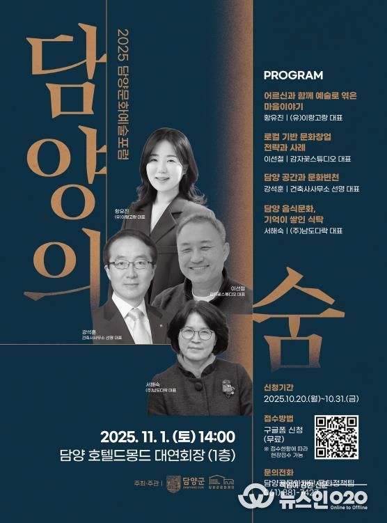 (뉴스인020 = 김성길 기자) 담양군문화재단은 11월 1일 토요일 오후 2시, 담양 호텔드몽드 대연회장에서 2025 담양 문화예술포럼 '담양의 숨'을 개최한다고 밝혔다.