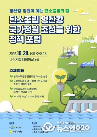 (뉴스인020 = 김성길 기자) 나주시의회는 나주시와 오는 28일 오후 2시, 나주시청 대회의실에서 '탄소중립 영산강 국가정원 조성을 위한 정책포럼'을 공동 개최한다고 21일 밝혔다. 이번 포럼은 탄소중립 실현을 위한 다양한 전략을 모색하고, 향후 영산강 국가정원 지정의 구체적 방향을 논의하기 위해 마련됐다.