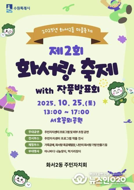 이번 행사는 “화서2동 주민 모두 함께 즐기는 축제”를 주제로, 주민이 직접 참여하고 만드는 화합의 축제로 기획됐다. 주민자치센터 수강생들의 한 해 활동을 공유하는 작품발표회, 지역 동아리와 어린이들의 무대 공연, 주민이 함께 즐길 수 있는 체험 부스와 먹거리 장터 등 다채로운 프로그램이 마련된다.