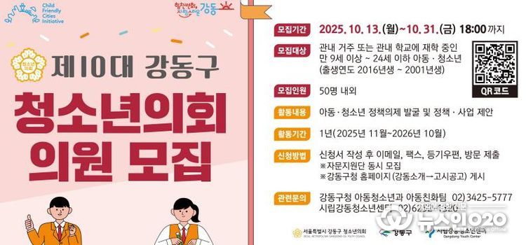 (뉴스인020 = 김성길 기자) 강동구는 오는 10월 31일까지 강동구 아동‧청소년을 대상으로 ‘제10대 강동구 청소년의회’ 의원을 모집한다고 밝혔다.