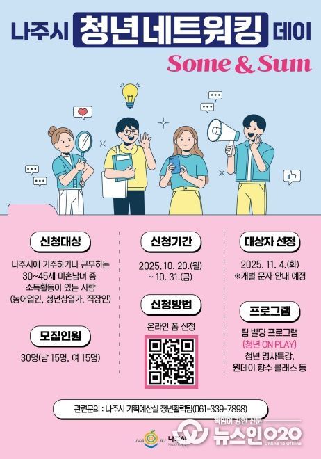 (뉴스인020 = 김성길 기자) 전라남도 나주시가 지역 청년들의 교류와 소통을 활성화하기 위해 미혼청년을 대상으로 한 ‘청년 네트워킹 데이’ 참가자를 모집한다.