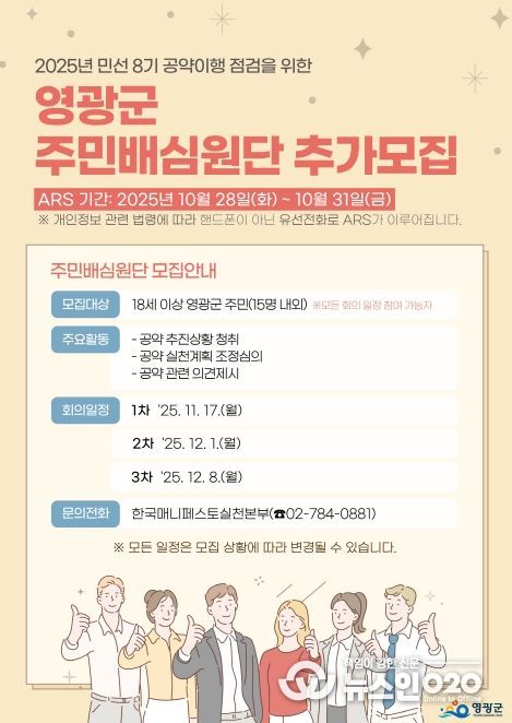 (뉴스인020 = 김성길 기자) 영광군은 민선 8기 공약 이행 사항을 점검할 ‘주민배심원단’을 추가로 모집한다고 24일 밝혔다.