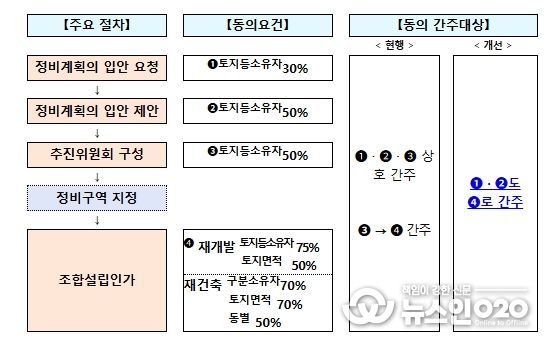 복잡한 행정절차, 동의 확보는 최대한 한번에, 미리 처리할 수 있게 하고, 조합이 확보해야 하는 국ㆍ공유지 확보 부담을 완화할 수 있도록 규제 합리화 방안을 담았다.
