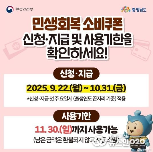 (뉴스인020 = 김성길 기자) 2차 민생회복 소비쿠폰의 신청 기한이 오는 31일 마감되는 가운데, 충남도가 도내 미신청자에 대해 기한 내 신청·사용할 것을 당부했다.