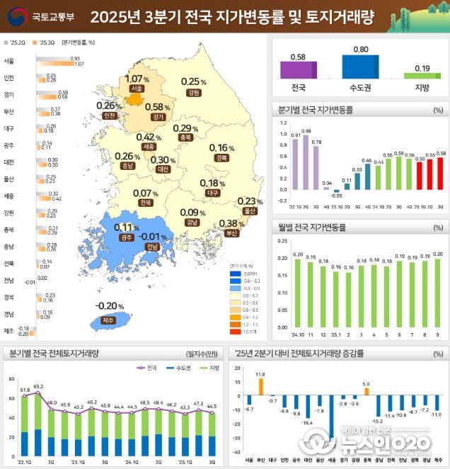 (뉴스인020 = 김성길 기자) 국토교통부와 한국부동산원(원장 손태락)은 '25년 3분기 지가변동률 및 토지거래량을 발표했다.