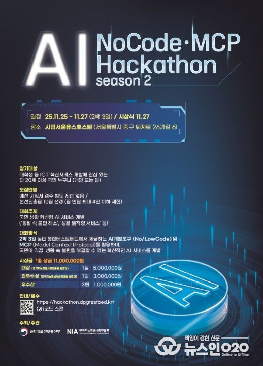 (뉴스인020 = 김나현 기자) 과학기술정보통신부가 주최하고 한국지능정보사회진흥원(원장 황종성,)이 주관하는 “인공지능(AI) 노코드 끝장 개발대회(해커톤) 2025” 대회가 오는 11월 25일부터 27일까지 서울 유스호스텔(중구 소재)에서 개최된다.