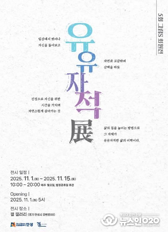 (뉴스인020 = 김성길 기자) 안성천 우리동네 작은미술관 결갤러리에서는 오는 11월 1일부터 15일까지 그림스아뜰리에 제5회 회원전 ‘유유자적’이 열린다. 이번 전시는 바쁜 일상 속에서 잠시 걸음을 멈추고, 자연과 교감하듯 마음을 산책하는 여유의 시간을 주제로 마련됐다.