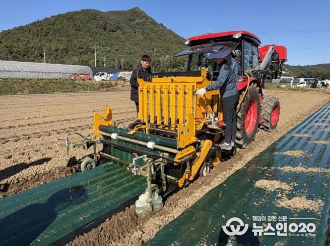 이날 연시회에서는 두둑 형성, 비닐멀칭, 파종, 농약 살포가 한 번에 가능한 마늘 복합파종기가 시연됐다.