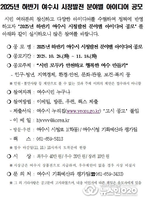 (뉴스인020 = 김성길 기자) 여수시는 시민의 창의적인 제안을 수렴해 정책에 반영하기 위해 오는 11월 18일까지 ‘2025년 하반기 시정발전 분야별 아이디어 공모’를 진행하고 있다.