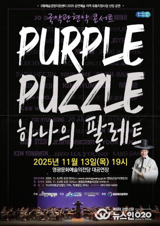 (뉴스인020 = 김성길 기자) 영광군(군수 장세일)은 오는 11월 13일 오후 7시에 영광문화예술의전당 대공연장에서 국악관현악단 코라이즌의 ‘PURPLE PUZZLE:하나의 팔레트’를 공연한다.