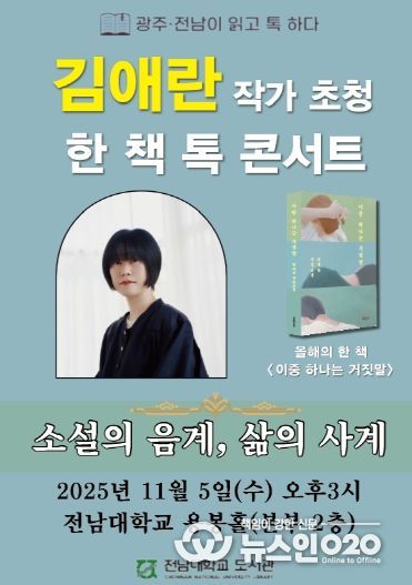 29일 전남대(총장 이근배)에 따르면 오는 11월 5일 오후 3시 전남대학교 용봉홀에서 「이중 하나는 거짓말」의 저자 김애란 작가를 초청해 ‘작가 초청 한 책 톡 콘서트’를 개최한다.