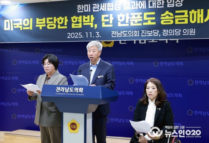 (뉴스인020 = 김성길 기자) 전라남도의회 박형대의원(진보당ㆍ장흥1)은 3일 도의회 브리핑룸에서 최근 타결된 ‘10.29 한미 관세협상’에 대한 진보당, 정의당 공동 기자회견에 참석해 공동 입장을 발표했다.