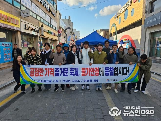 (뉴스인020 = 김성길 기자) 전남 무안군은 지난 1일부터 2일까지 개최된 무안갯벌낙지축제 동안 공직자, 무안전통시장상인회, 물가모니터요원 등 20여 명이 참여해 바가지요금 근절 및 물가안정 캠페인을 실시했다.