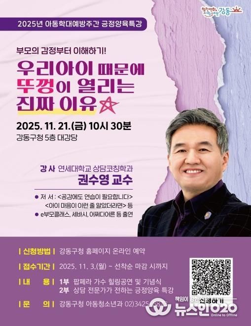 (뉴스인020 = 김성길 기자) 서울 강동구는 오늘 21일 ‘2025년 강동구 아동학대 예방의 날 기념식’을 개최하고, 연세대학교 상담코칭학과 권수영 교수의 특강을 진행한다고 밝혔다.