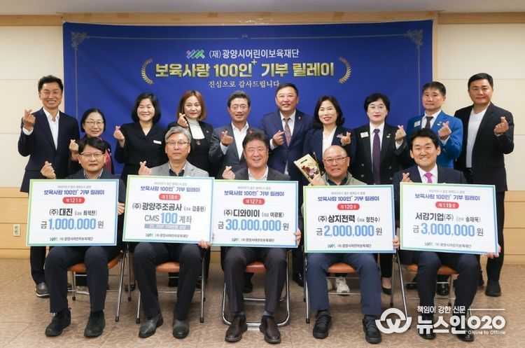 (뉴스인020 = 김성길 기자) (재)광양시어린이보육재단은 지난 11월 7일 광양시청 만남실에서 정인화 광양시장, 이광용 이사장, 기탁자 등 20여 명이 참석한 가운데 보육사랑 100인+ 기부 릴레이 후원금 기탁식을 개최했다.