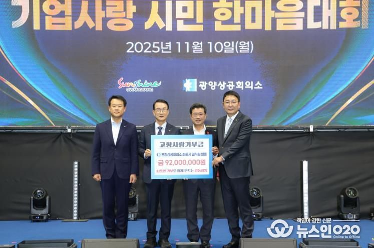 (뉴스인020 = 김성길 기자) 광양시는 지난 11월 10일 광양실내체육관에서 열린 '제4회 광양시 기업인의 날' 기념식에서 포항상공회의소와 13개 회원사 임직원이 광양시에 고향사랑 기부금 9,200만 원을 전달했다고 밝혔다.