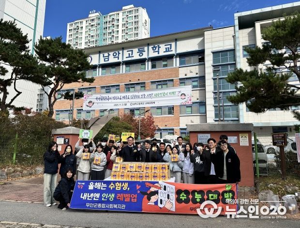 (뉴스인020 = 김성길 기자) 무안군종합사회복지관은 11일 남악고등학교에서, 2026년도 대학수학능력시험을 앞둔 수험생들을 격려하기 위한 ‘수능 응원 이벤트’활동을 펼쳤다.
