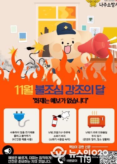 (뉴스인020 = 김성길 기자) 나주소방서(서장 신향식)는 겨울철을 앞두고 화재 발생 위험이 높아지는 시기에 맞춰 ‘11월 불조심 강조의 달’을 운영하여 시민 모두가 함께 실천하는 안전한 난방·전기 화재 예방을 당부했다.