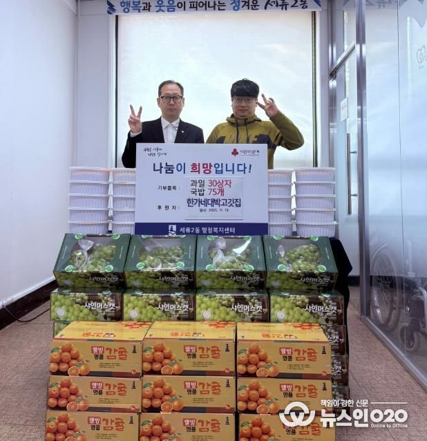 (뉴스인020 = 기자) 수원시 권선구 세류2동에 위치한 '한가네 대박고깃집'은 지난 13일, 국밥 75개와 귤 10상자, 샤인머스캣 20상자를 세류2동 행정복지센터에 기부했다.