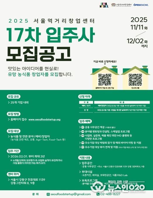 (뉴스인020 = 김성길 기자) 서울시는 전 세계적으로 확산 중인 K-푸드 열풍 속에서 농식품 분야 유망 스타트업의 성장을 본격 지원하기 위해 ‘서울먹거리창업센터’ 신규 입주기업을 12월 2일까지 공개 모집한다고 밝혔다.