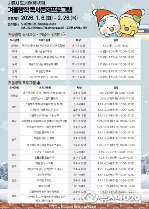 (뉴스인020 = 김성길 기자) 시흥시는 겨울방학을 맞아 북부권 8개 공공도서관(소래빛ㆍ대야ㆍ목감ㆍ능곡ㆍ장곡ㆍ은계ㆍ신천ㆍ매화)에서 1월 6일부터 2월 26일까지 겨울독서교실 및 겨울방학 프로그램을 운영한다.