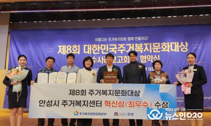 (뉴스인020 = 김성길 기자) 안성시 주거복지센터는 지난 20일 국회도서관 대강당에서 열린 제8회 대한민국 주거복지문화대상 시상식에서 주거복지 분야 발전에 공헌한 성과를 인정받아 혁신상(최우수상) 수상 및 문화체육관광위원장 표창을 받았다고 밝혔다.