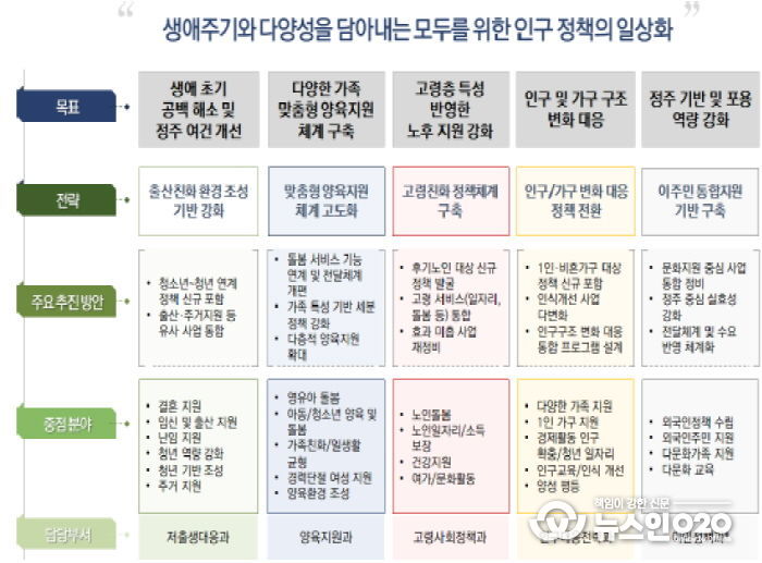 보고서는 경기도 인구정책의 비전을 ‘생애주기와 다양성을 담아내는 모두를 위한 인구정책의 일상화’로 설정하고, ▲생애 초기 공백 해소 및 기반 조성 ▲다양한 가족형태 맞춤형 양육지원 체계 구축 ▲고령층 특성 반영한 노후지원 강화 ▲인구 및 가구 구조 변화 대응 ▲정주 기반 및 포용 역량 강화라는 5대 정책목표를 제시했다.