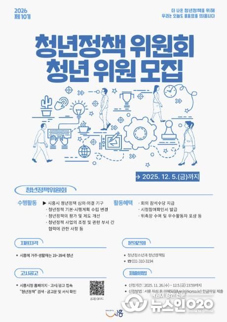(뉴스인020 = 김성길 기자) 시흥시는 청년들의 다양한 목소리를 들을 수 있는 제10기 시흥시 청년정책위원회 청년위원을 오는 12월 5일까지 공개 모집한다.