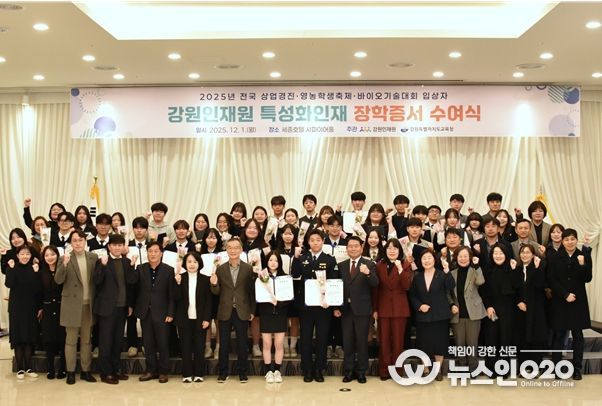 (뉴스인020 = 김성길 기자) 강원인재원은 12월 1일 11시, 춘천 세종호텔 사파이어홀에서 올해 치뤄진 전국 고교생 상업경진대회·영농학생축제·바이오기술경진대회에서 입상한 강원특별자치도 특성화인재 70명에 대한 장학증서 수여식을 개최했다고 밝혔다.