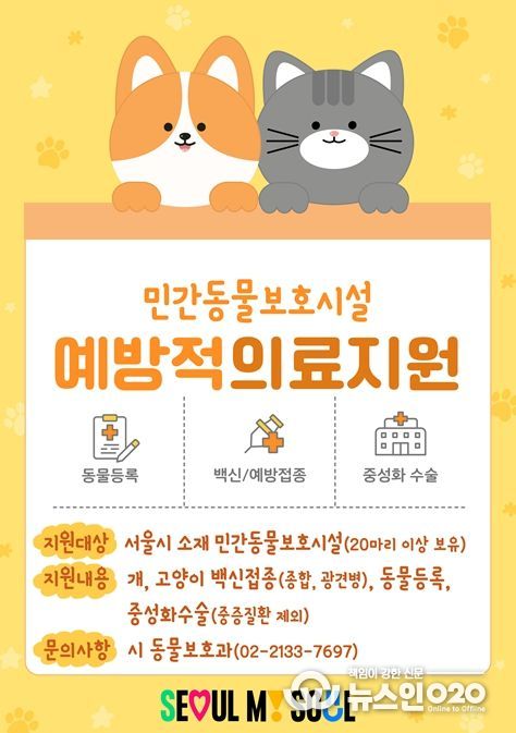 (뉴스인020 = 김성길 기자) 서울시는 소규모 민간동물 보호시설을 대상으로 ‘수의사가 찾아가는 예방 중심의 필수 의료 서비스’를 무상으로 지원하고 있다고 밝혔다. 올해 8월에 시작해 현재까지 9개 민간동물보호시설 대상 총 686건의 의료 지원을 했다.