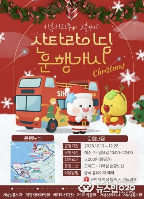 (뉴스인020 = 김성길 기자) 시흥시는 연말을 맞아 오이도~거북섬을 순환하는 2층 버스에 크리스마스 테마를 적용한 특별 운행 ‘산타라이딩’을 12월 10일부터 운영한다. 이번 테마 운행은 겨울철 해양 관광 활성화와 연말 분위기 조성을 위해 조성을 위해 마련된 것으로, 12월 28일까지 운행되며 상황에 따라 기간은 연장될 수 있다.