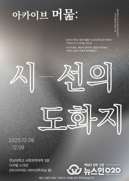 전남대학교 미디어커뮤니케이션학과(학과장 신우열)는 학과 행사 ‘미디어 WEEK’의 일환으로 아카이브 전시 ‘머묾: 시선의 도화지’를 12월 8일부터 9일까지 전남대 용봉캠퍼스 사회과학대학 3층 디지털스크린에서 개최한다.