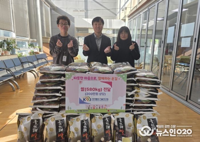 (뉴스인020 = 김성길 기자) 의왕시는 한국철도기술연구원이 12월 5일 지역 내 소외계층을 지원하기 위해 쌀 580kg(200만원 상당)을 부곡동주민센터에 전달했다고 밝혔다.