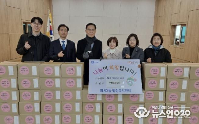(뉴스인020 = 기자) 수원시 팔달구 화서2동은 지난 9일, 연말을 맞아 관내 취약계층의 생활 안정을 돕기 위해 수원영광교회가 마련한 생필품 기프트박스 100상자 전달식을 진행했다고 밝혔다. 이번 후원은 갑작스러운 한파로 동절기 어려움을 겪는 이웃들이 조금이나마 따뜻한 겨울을 보낼 수 있도록 하자는 취지에서 마련됐다.
