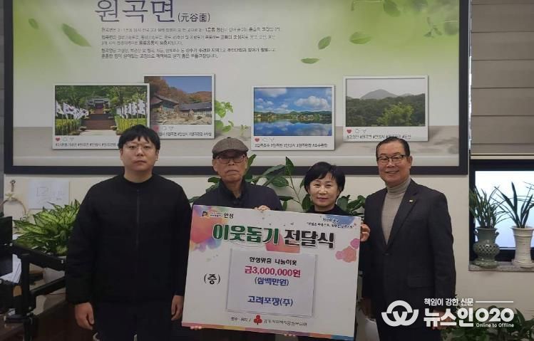 (뉴스인020 = 김성길 기자) 기업의 사회적책임 실현과 이웃 사랑을 꾸준히 실천해 온 ㈜고려포장 조양래, 조현창 대표는 12월 9일 원곡면 행정복지센터를 찾아 어려운 이웃을 돕기 위한 성금 3백만 원을 기탁했다. ㈜고려포장 대표는 작년 11월 3백만 원 성금 기탁에 이어 올해에도 취약계층을 위한 온정의 손길을 전했다.