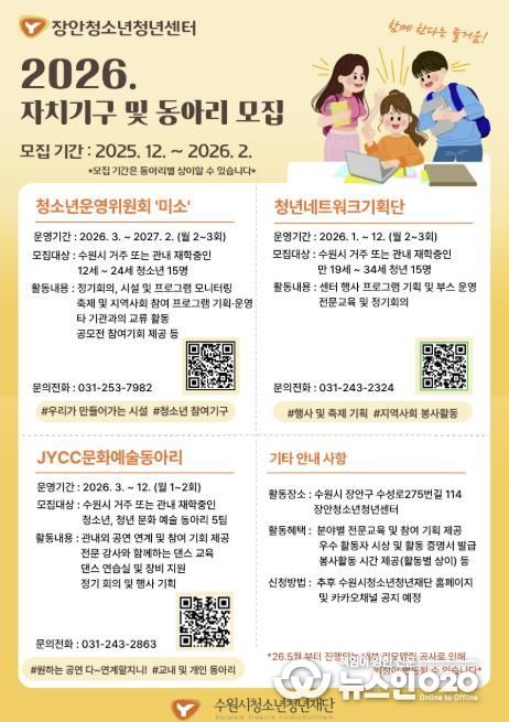 (뉴스인020 = 기자) 수원시청소년청년재단 장안청소년청년센터는 2025년 12월 16일부터 청소년 수련시설 및 지역사회의 변화를 이끌어갈 청소년과 청년 지원자를 모집한다.