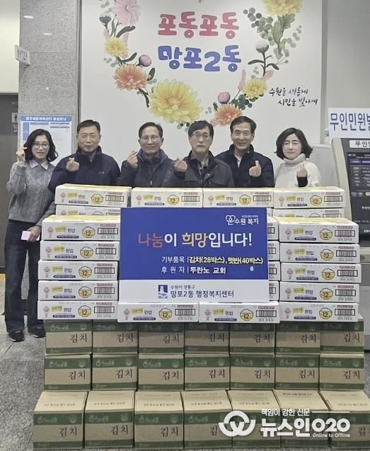 (뉴스인020 = 기자) 수원시 영통구 망포2동에 위치한 두란노교회는 지난 16일, 지역 내 취약계층을 돕기 위해 김치 28박스와 햇반 40박스를 망포2동 행정복지센터에 기탁했다.