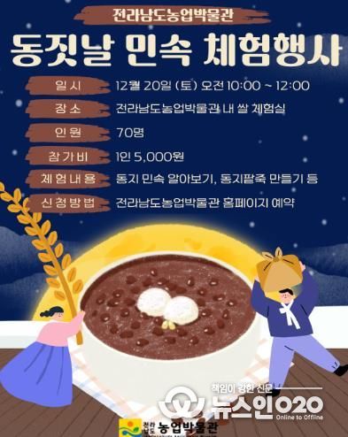 (뉴스인020 = 김성길 기자) 전라남도농업박물관은 잊혀가는 전통 절기 문화인 동짓날의 의미를 되새기기 위해 21일 오전 10시부터 12시까지 박물관 쌀 체험실에서 ‘동짓날 민속 체험행사’를 연다.