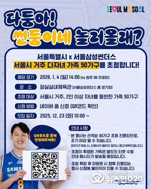 (뉴스인020 = 김성길 기자) 서울시가 2026년 새해를 맞아 1월 4일 오후 2시 잠실실내체육관(송파구 올림픽로 25)에서 열리는 서울시 연고 구단 ‘서울삼성썬더스농구단’의 홈경기에 다자녀 50가족을 무료 초청한다.
