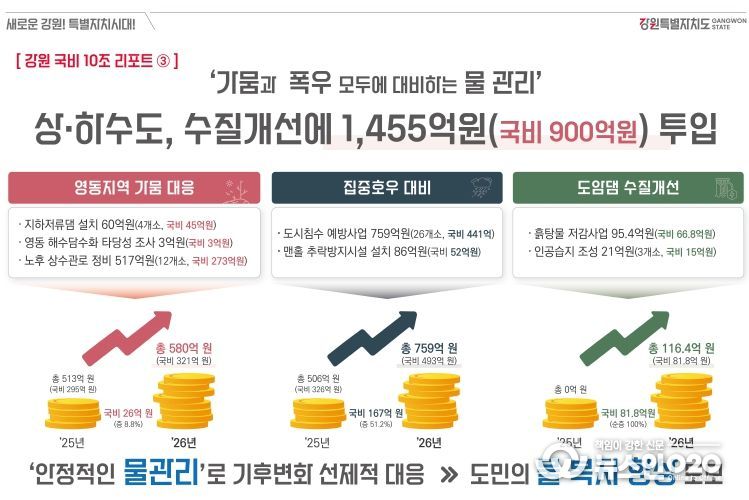 (뉴스인020 = 김성길 기자) 강원특별자치도는 내년도에 1,455억 원을 투입하여 가뭄 및 집중호우 등 물로 인한 기후변화와 자연재해로부터 안전한 강원자치도를 만들어 나갈 계획을 밝혔다.