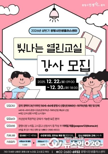 (뉴스인020 = 김성길 기자) 광명시는 오는 30일까지 ‘2026년 상반기 빛나는 열린교실’에 참여할 신중년 아마추어 강사를 모집한다.
