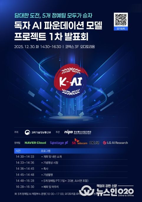 (뉴스인020 = 김나현 기자) 과학기술정보통신부와 정보통신산업진흥원(원장 박윤규)은 오는 12월 30일 14:30, 코엑스 오디토리움에서, 「독자 AI 파운데이션 모델」 프로젝트 1차 발표회를 개최한다.
