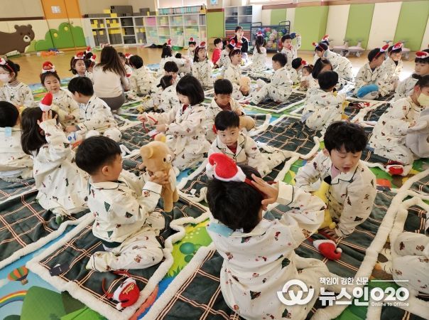 유아들은 “유치원이 집 같아요”, “친구랑 같이 자는 것 같아서 좋아요”, “메리 크리스마스!”라며 즐거운 소감을 전했고, 파자마 차림으로 편안하게 활동에 참여하는 모습이 눈길을 끌었다.