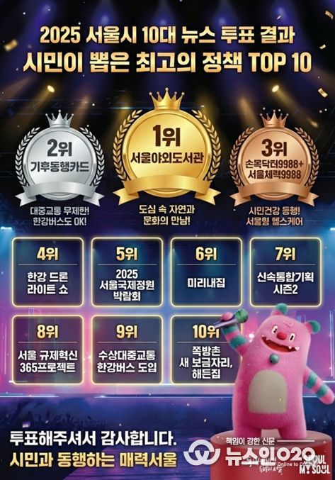울시는 12월 19일까지 진행한 ‘2025 서울시 10대 뉴스’ 투표에서 ‘서울야외도서관’이 11만 2762표(17.1%)로 1위를 차지했다고 밝혔다. 2위는 ‘기후동행카드(11만927표, 16.9%)’, 3위는 ‘손목닥터9988+서울체력9988(8만9845건, 13.7%)’ 였다.