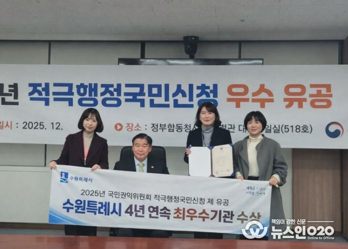 수원시는 24일 정부서울청사 정부합동민원센터에서 열린 2025 국민권익위원회 적극행정국민신청제 우수기관 시상식에서 상장을 받았다. 수원시는 적극행정국민신청제가 도입된 2022년부터 올해까지 4년 연속 우수기관으로 선정되는 성과를 거뒀다.