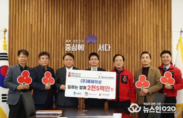 (뉴스인020 = 김성길 기자) 충북도는 24일 도청 여는마당에서 청주오스코 민간위탁 운영사인 ㈜메쎄이상이‘일하는 밥퍼’지원을 위해 2천5백만원을 기탁했다고 밝혔다.